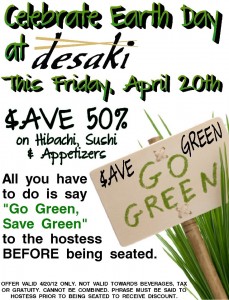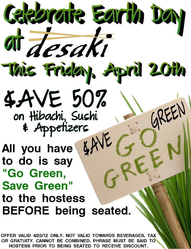 Just say “Go Green, Save Green’ to the hostess PRIOR to being seated.