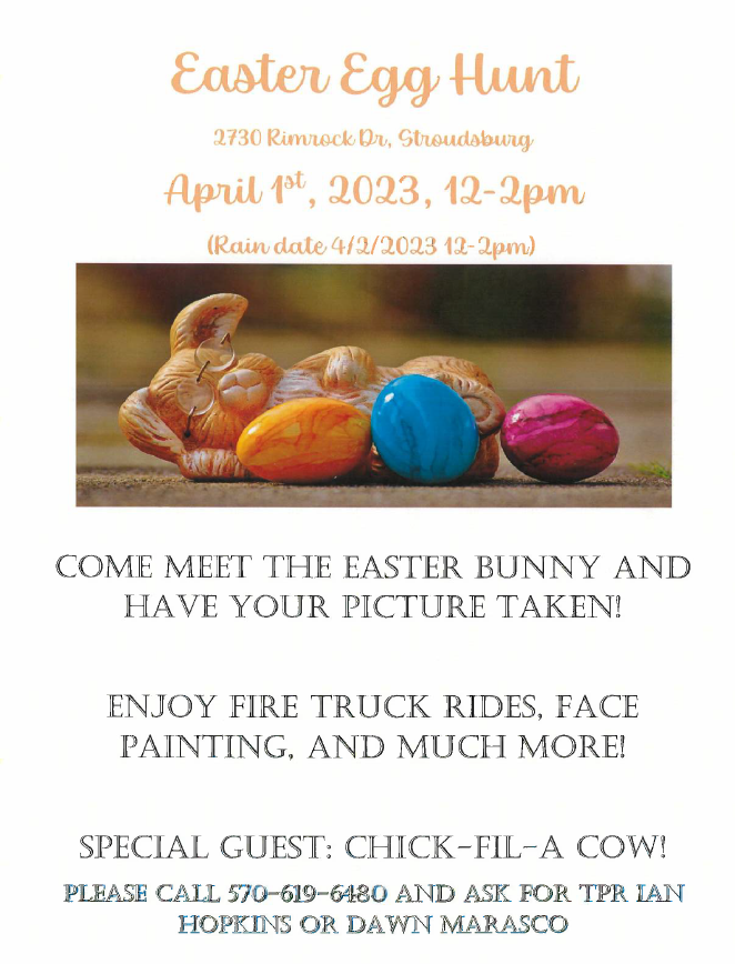 Pennsylvania State Police Stroudsburg is hosting a FREE Easter Egg Hunt on Saturday, April 1st, 2023 from 12pm-2pm.
