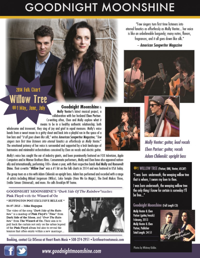 Goodnight Moonshine is Molly Venter’s latest musical project, a collaboration with her husband Eben Pariser. Co-writing often, Eben and Molly explore what it means to be in a healthy authentic relationship; both wholesome and irreverent, they sing of joy and grief in equal measure. Molly’s voice bends from a sweet moan to a gritty shout and back into a playful run in the space of a few bars and “it all goes down like silk,” writes American Songwriter Magazine; “few singers turn first time listeners into eternal fanatics as effortlessly as Molly Venter.” The emotional potency of her voice is surrounded and supported by a lush landscape of harmonies and minimalist orchestrations conceived by Eben on vocals and electric guitar. Molly’s voice has caught the ear of industry giants, and been prominently featured on FOX television, Apple Computers and in Warner Brothers films. Consummate performers, Molly and Eben have also appeared nationally and internationally, performing 100+ shows a year, with their respective bands Red Molly and Roosevelt Dime. Their co-write “Willow Tree” was a #1 hit on the folk charts in 2014 and was featured in USA Today. The group tours as a trio with Adam Chilenski on upright bass.