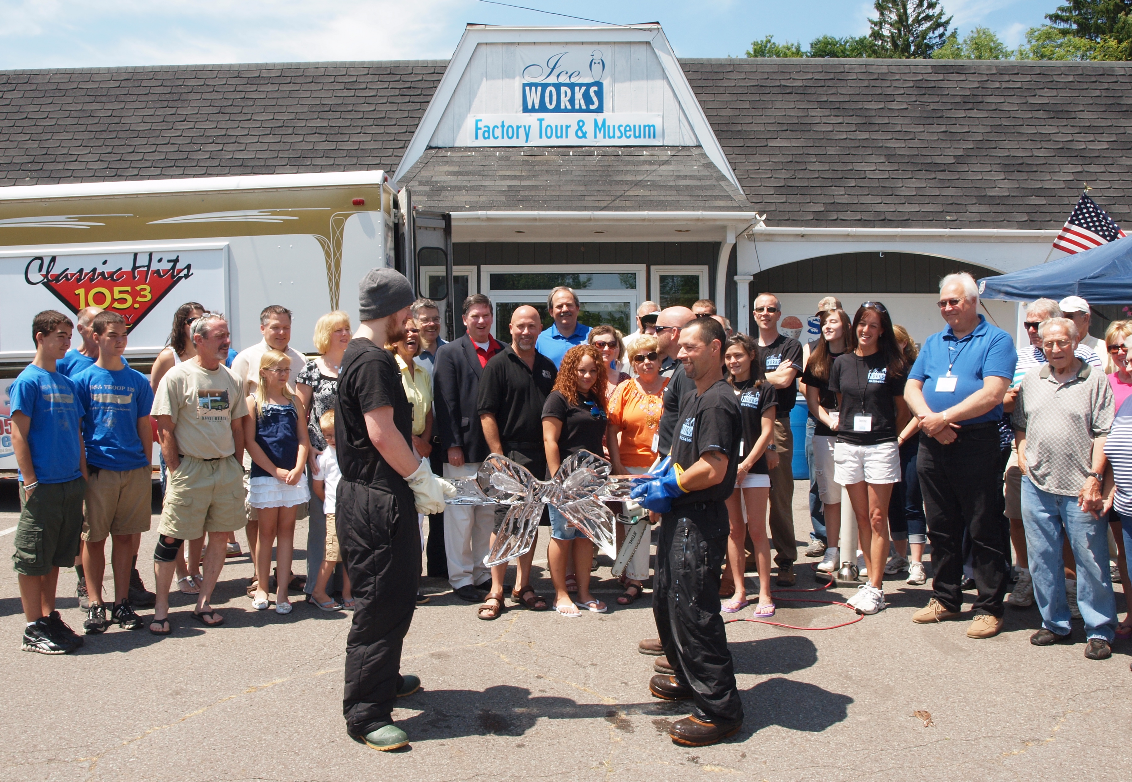 LAKEVILLE, PA:The Sculpted Ice Works Factory Tour and Natural Ice Harvesting Museum held a Grand Opening June 30. In a fun spin on the traditional ribbon cutting, employees carved a ribbon from ice and presented it be “cut” with a chainsaw by owner Mark Crouthamel.