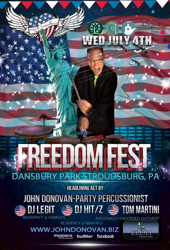You may remember John Donovan the Party Percussionist from an article with did with him back in April, so now’s your chance to see him live! He’ll be at Freedom Fest on July 4th, 2012 at Dansbury Park in Stroudsburg at 8pm along with DJ Legit, DJ Hit/Z and Tom Martini.