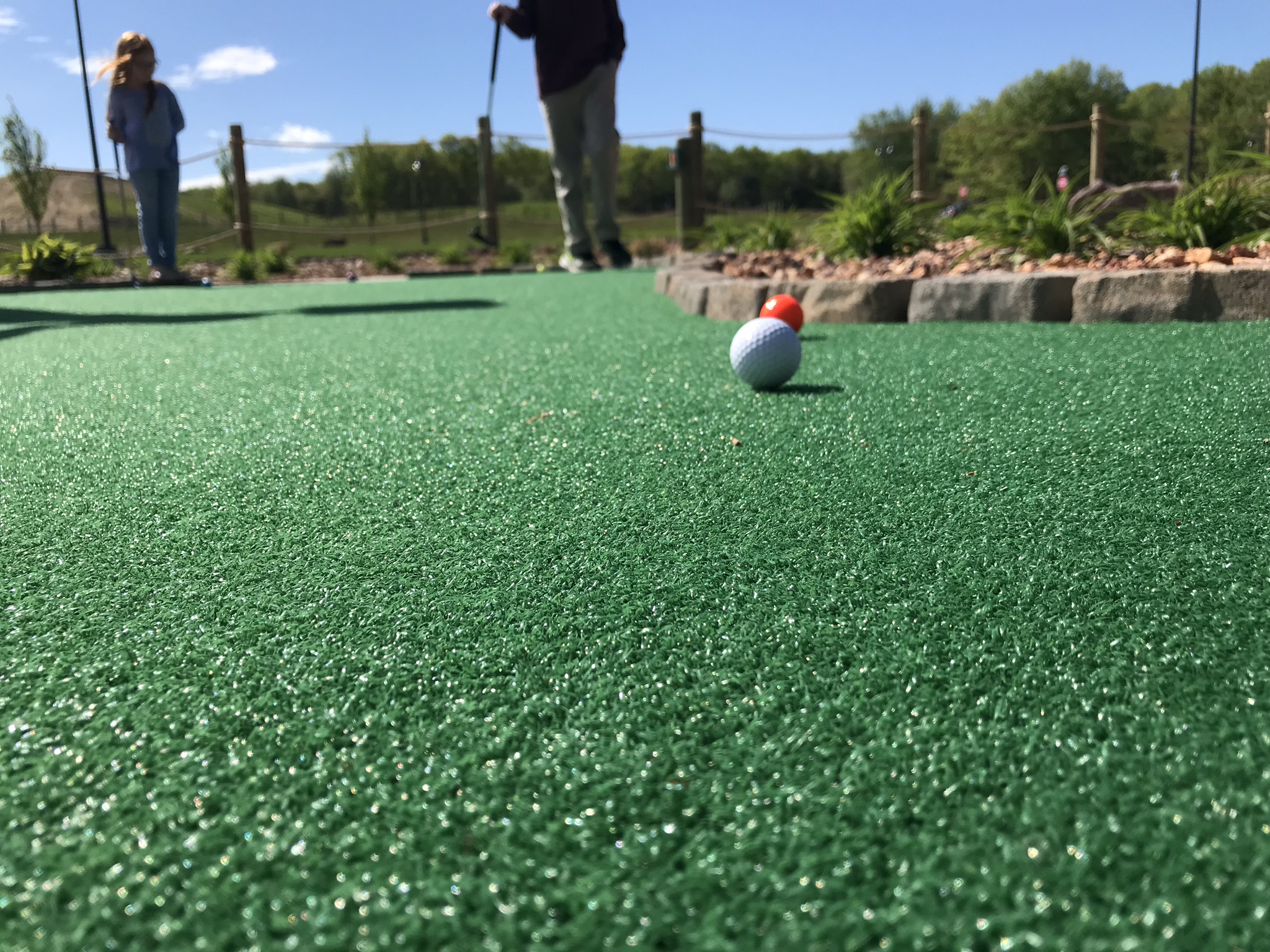 The Yellow Course is less flat, so it’s more challenging, and it is also has more shade, which makes day mini golf a lot easier on warmer days. Our kids especially loved Hole 12 where you have to hit your ball into the water as part of the course.