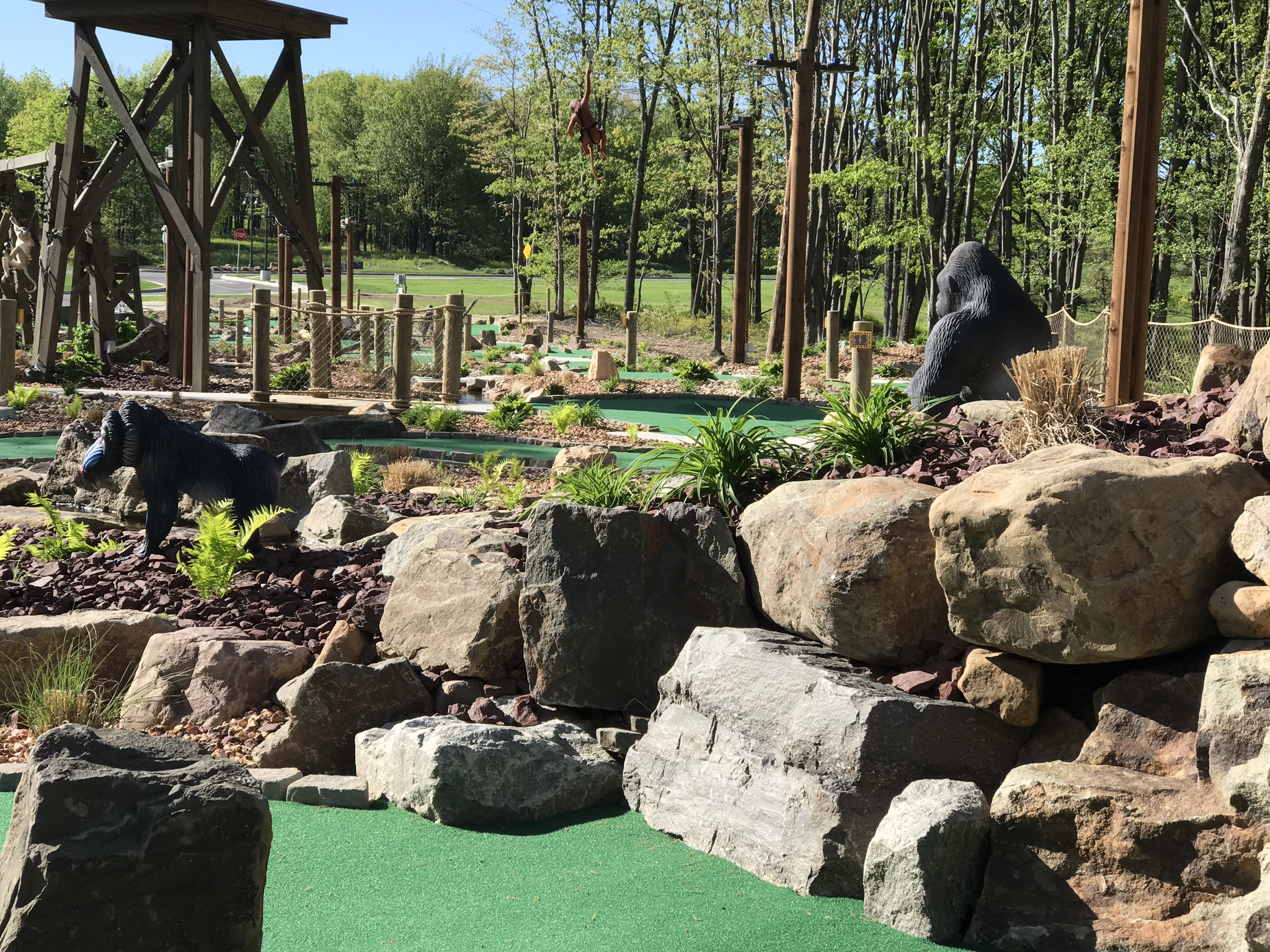 For mini-golf, prior to getting to the “Kalahari Complex”, on the left you’ll find Gorilla Grove Treetop Adventures. This is where you will find the Ropes Course and Zip Lines, and that’s where you can now find the Legends of the Lost Jungle Mini-Golf course. Mini-golf is a classic way to spend time with friends & family, and although some skill is involved, let’s be honest, having fun is the primary goal!