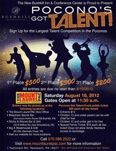 Saturday August 18th, 2012 beginning at 11:30AM at the Bushkill Inn & Conference Center is “Poconos Got Talent” – before you get too too excited it is not affiliated with Americas Got Talent so unfortunately the prizes are much…much…smaller then the 1 million AGT prize. The prize amounts are as follows: 1st Place: $500, 2nd Place $300 and 3rd place $200. There’s also a $15 entrance fee – call me old fashioned but I think if there is a $15 entry fee and $25 for passes for your family to come see the event…the prizes should be A LOT bigger then what they are. I also came across this: “Gates for parking open 2 hours 30 minutes before doors. Each vehicle entering the parking area will be charged $10 for parking. Parking fees are subject to change without notice.” Maybe I’m missing something, I think the closest I got to any competition was a spelling bee in grade school, so maybe it’s all just standard procedure?