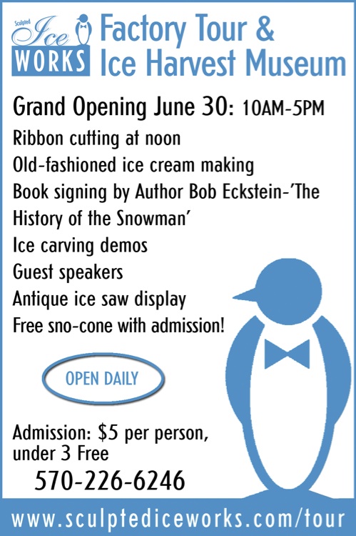 Check out the Grand Opening of Sculpted Ice Works Factory Tour & Ice Harvest Museum on June 30th, 2012 from 10AM to 5pm. There will be a ribbon cutting at noon followed by old-fashioned ice cream making, ice carving demos and more.